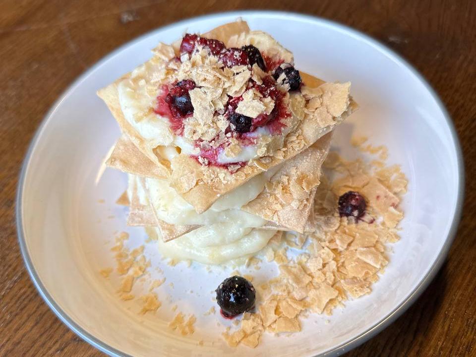 Un desert francez rafinat cu cremă, fructe de pădure proaspete și foitaj crocant.