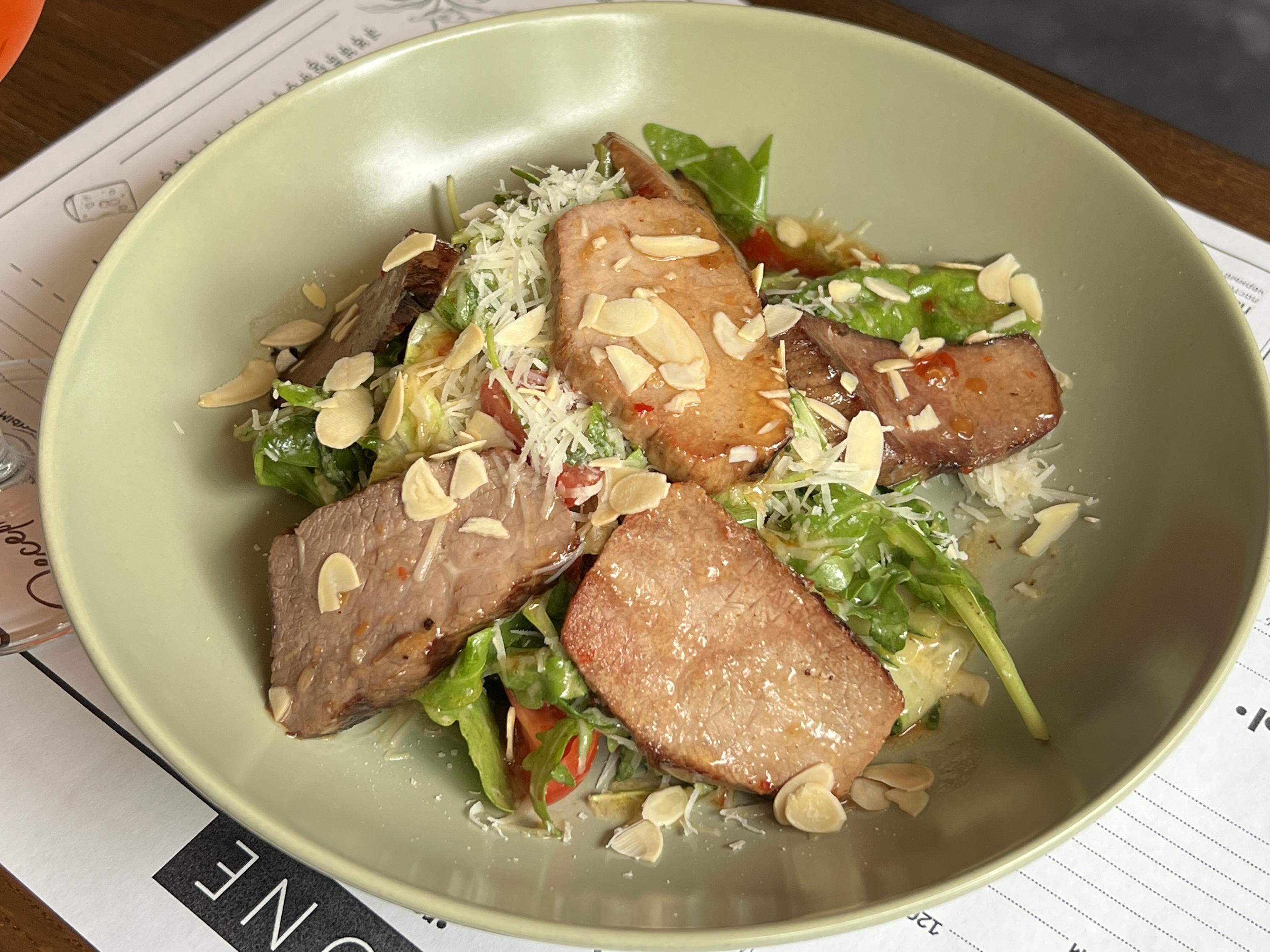 Mix de salată, roșii cherry, parmezan, fulgi de migdale, sos chili, mușchiuleț de vită.