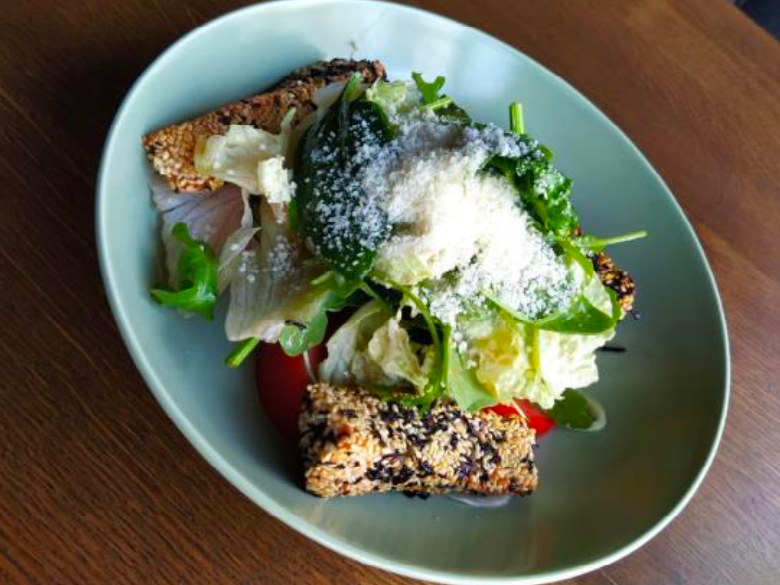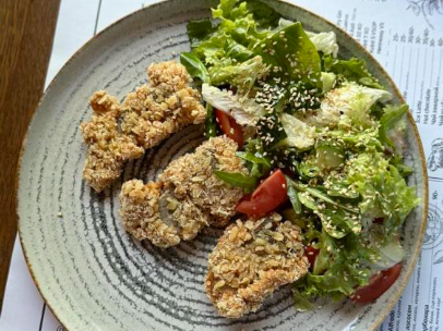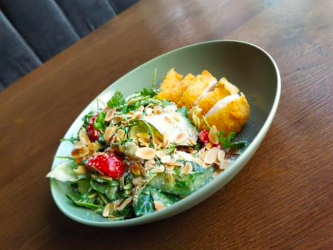 Mix de salată, somon pane, roșii, castraveți, parmezan, sos dulce-acrișor.