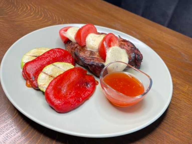 Steak fraged de porc, preparat la grătar, cu garnitură de legume proaspete de sezon.
