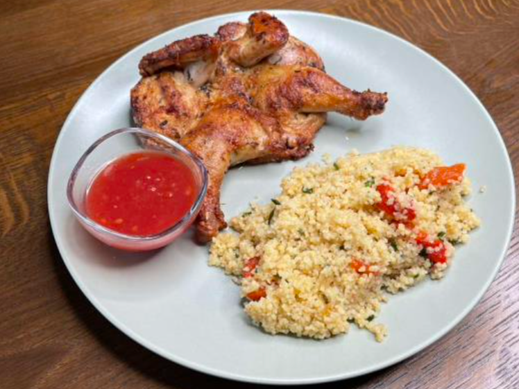 Puișor suculent, servit cu cușcuș aromat și adjika picantă.