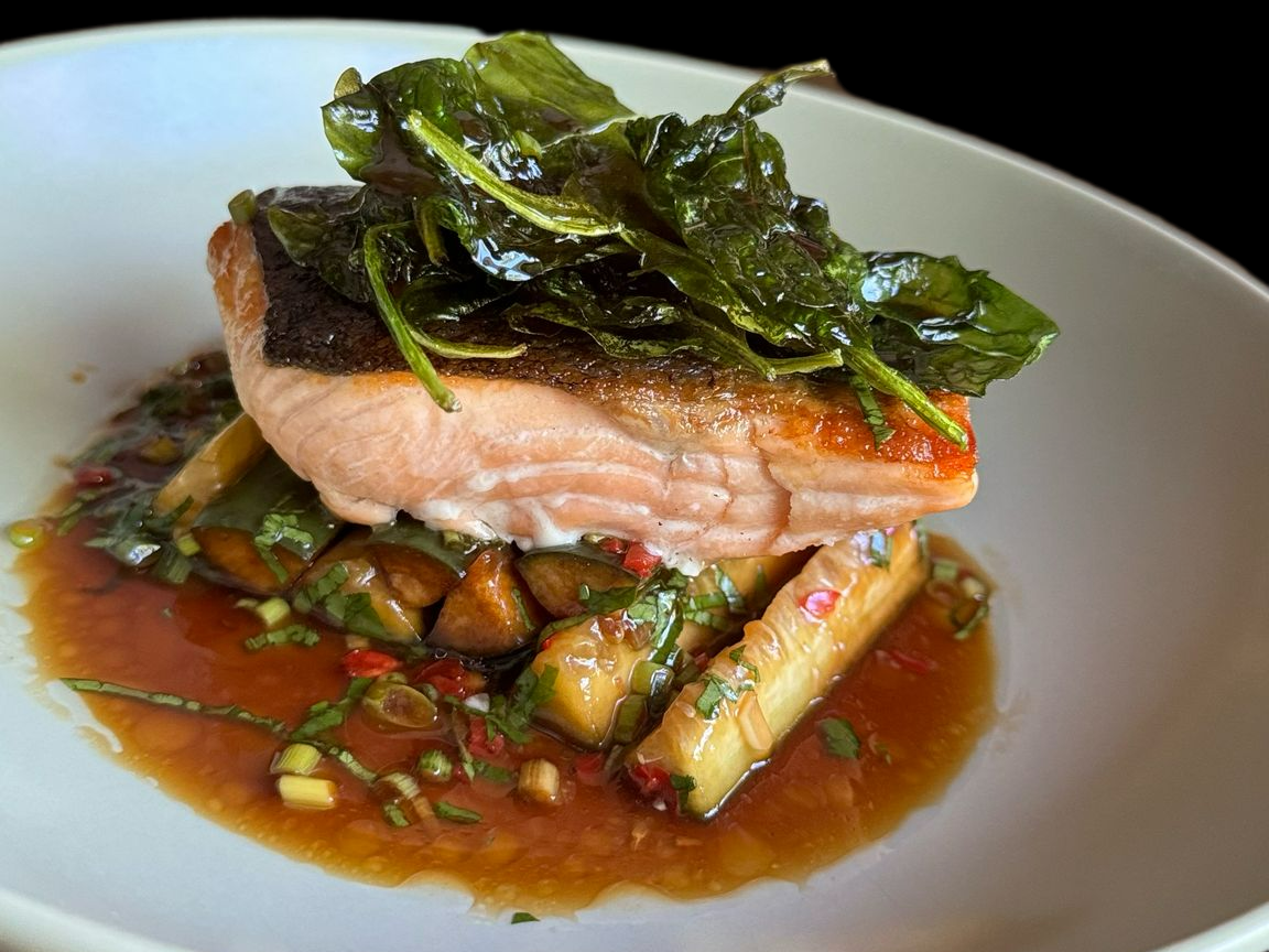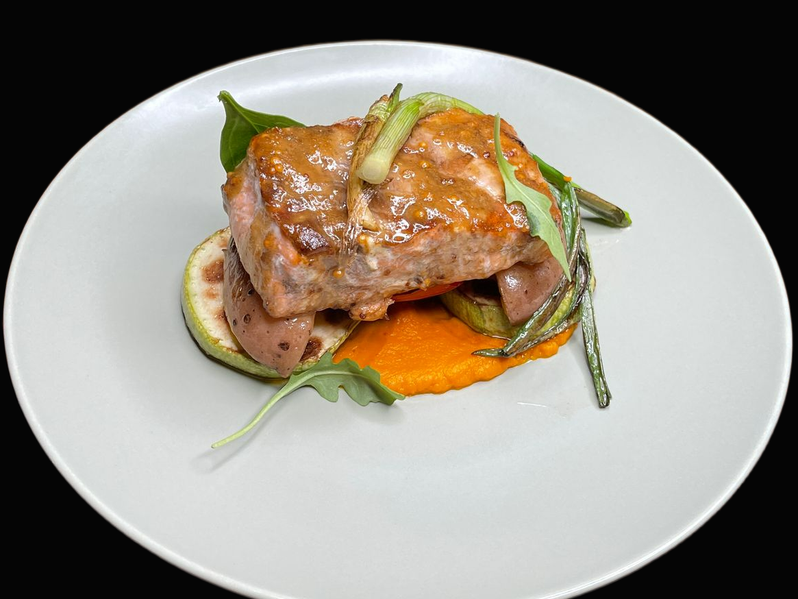 Somon la grătar cu legume și cremă de morcovi190 LEI