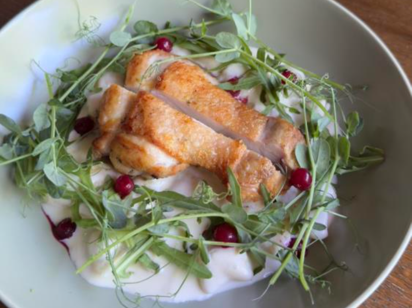 Gnocchi de casă din cartofi, serviți cu pulpă suculentă de pui și sos.