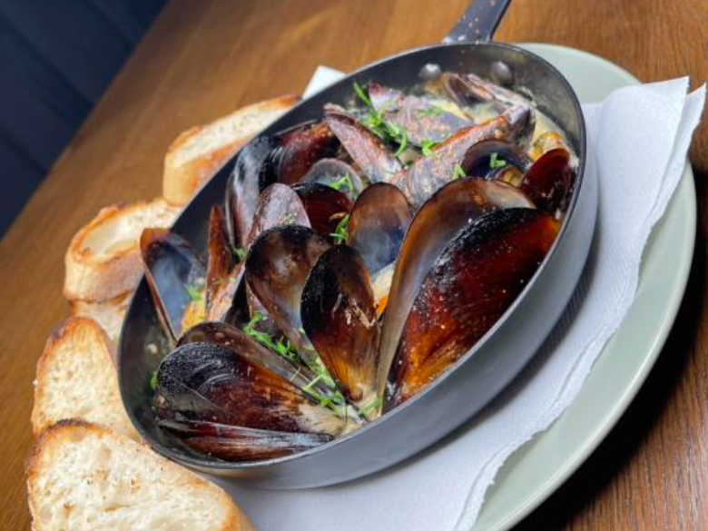 Midii proaspete, înăbușite într-un lecsó aromat de legume cu ierburi și vin alb.