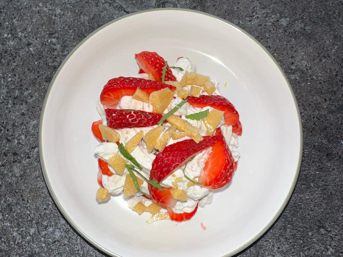 Căpșunile proaspete oferă desertului luminozitate și suculență, adăugând o ușoară aciditate, cea mai fină frișcă, iar accentul este caramelul sărat crocant.