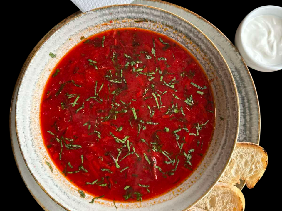 Borș roșu tradițional cu carne fragedă de vită, servit cu smântână și verdeață proaspătă.